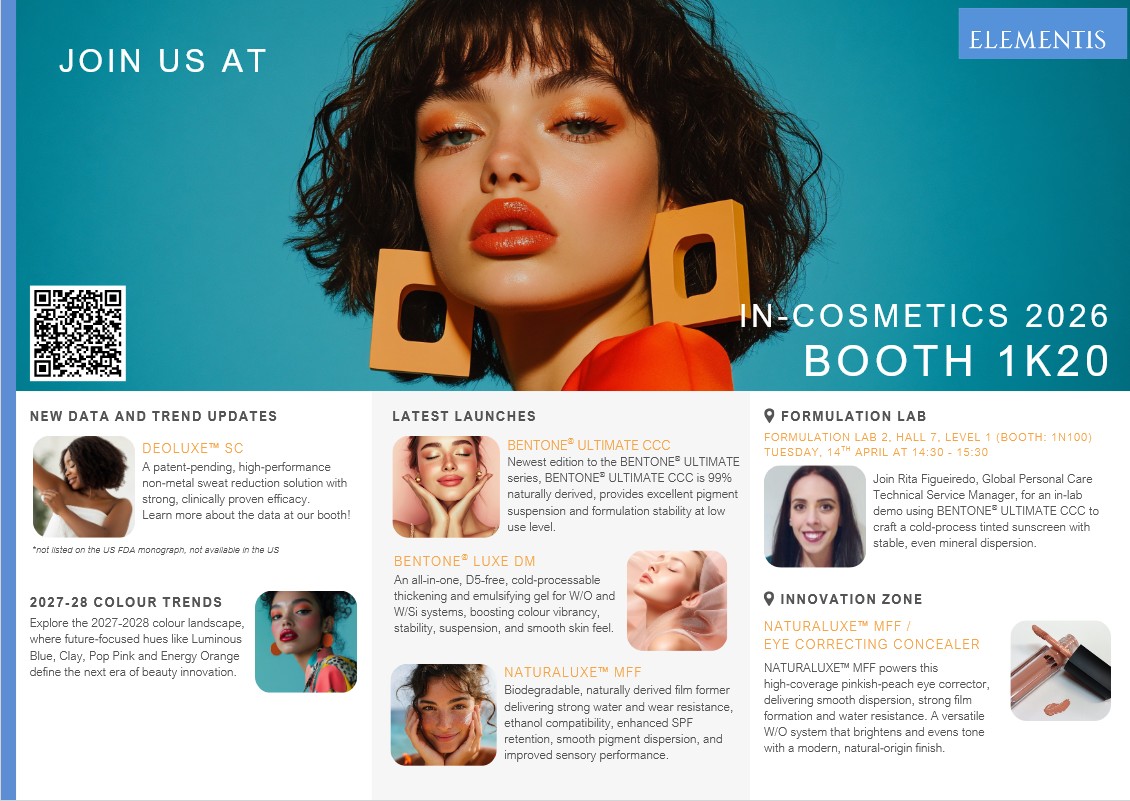 From 14 to 16 April at Paris Expo Porte de Versailles, we’ll be showcasing the newest highlights from Elementis Personal Care including three upcoming product launches designed to elevate innovation, performance and sensoriality in next‑generation formulations.